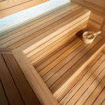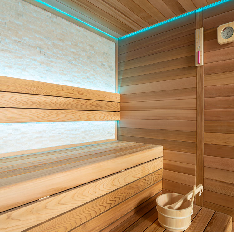 De sauna is afgewerkt met echt cederhout, een exclusieve houtsoort die bekend staat om zijn warme uitstraling, aangename geur en uitstekende duurzaamheid. In combinatie met de achterwand van hemlock en stijlvol zandsteen ontstaat een luxe en natuurlijke sfeer. De voorzijde is uitgevoerd in 10 mm ESG-veiligheidsglas (deur 8 mm), wat zorgt voor een robuuste en moderne uitstraling met extra stabiliteit.