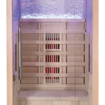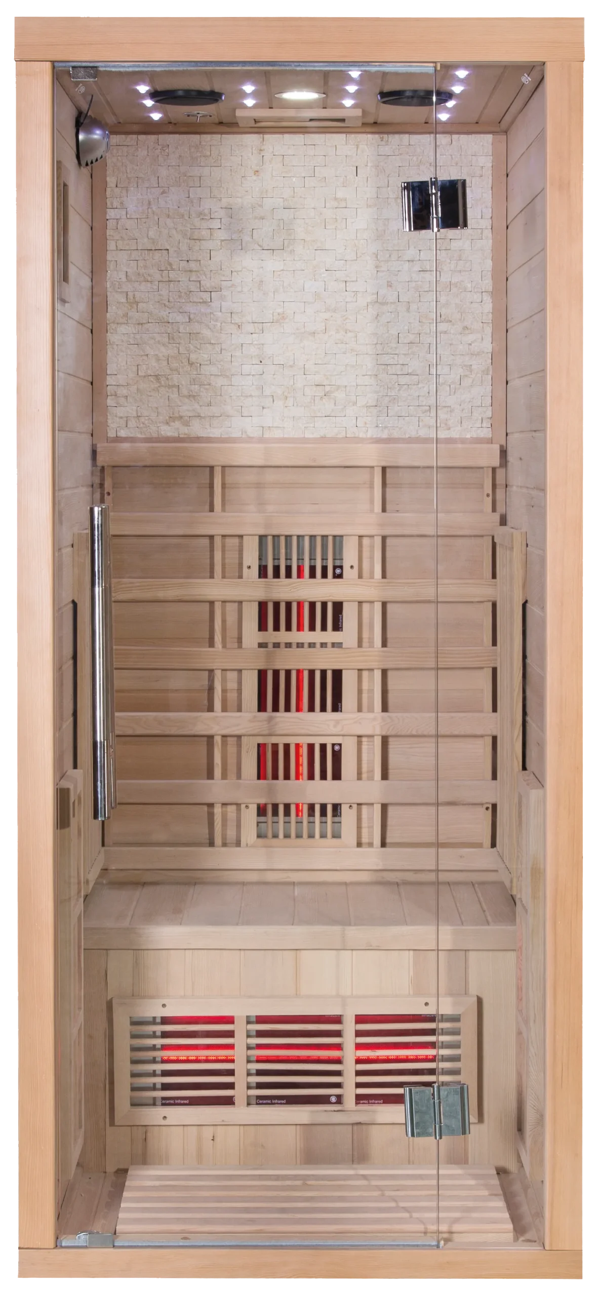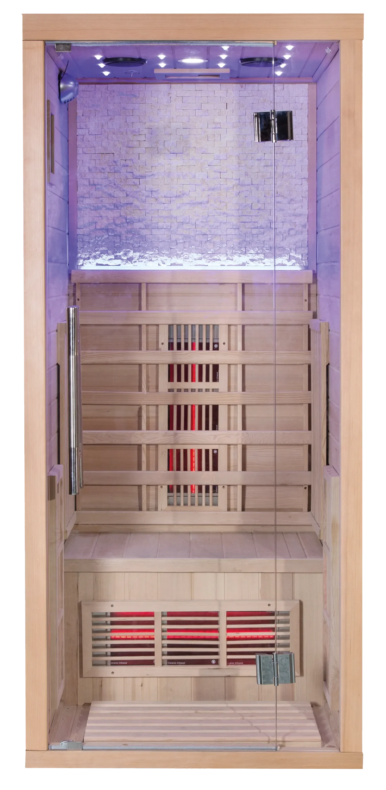 Deze compacte IR cabine is geschikt voor 1 persoon en is voorzien van 7 verwarmingselementen: 4 full spectrum IR stralers en 3 carbon warmtepanelen. De full spectrum stralers zijn instelbaar.
