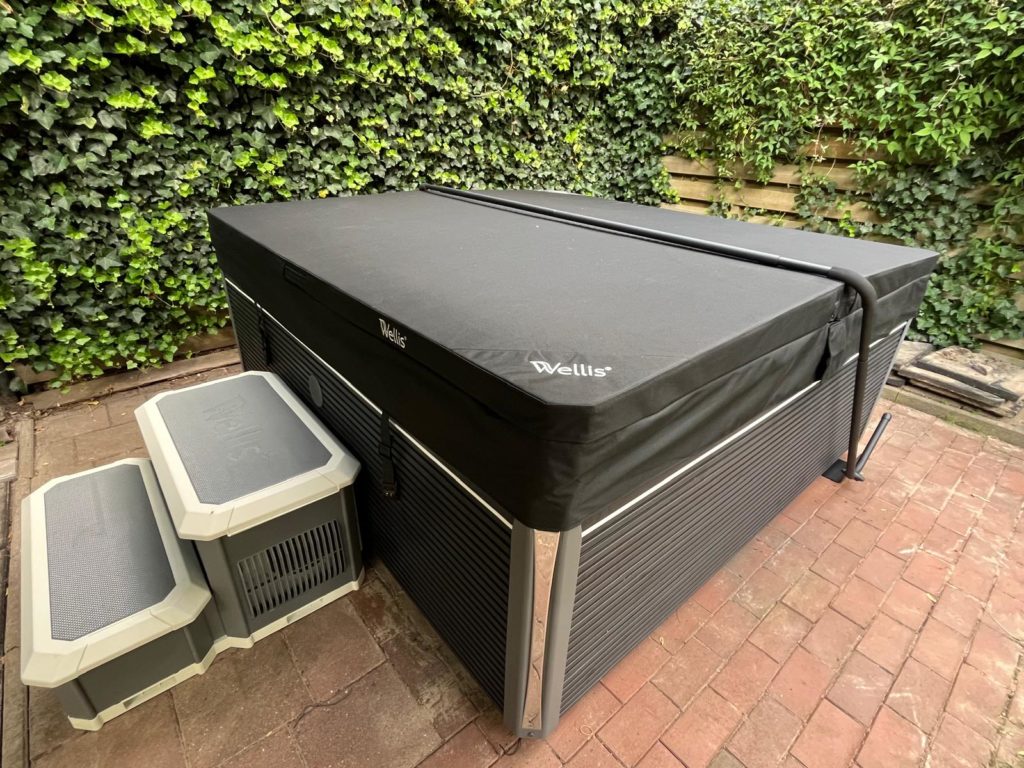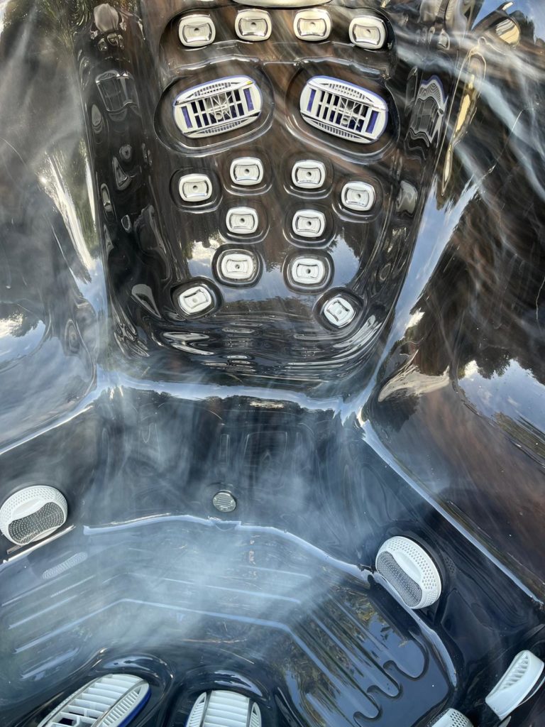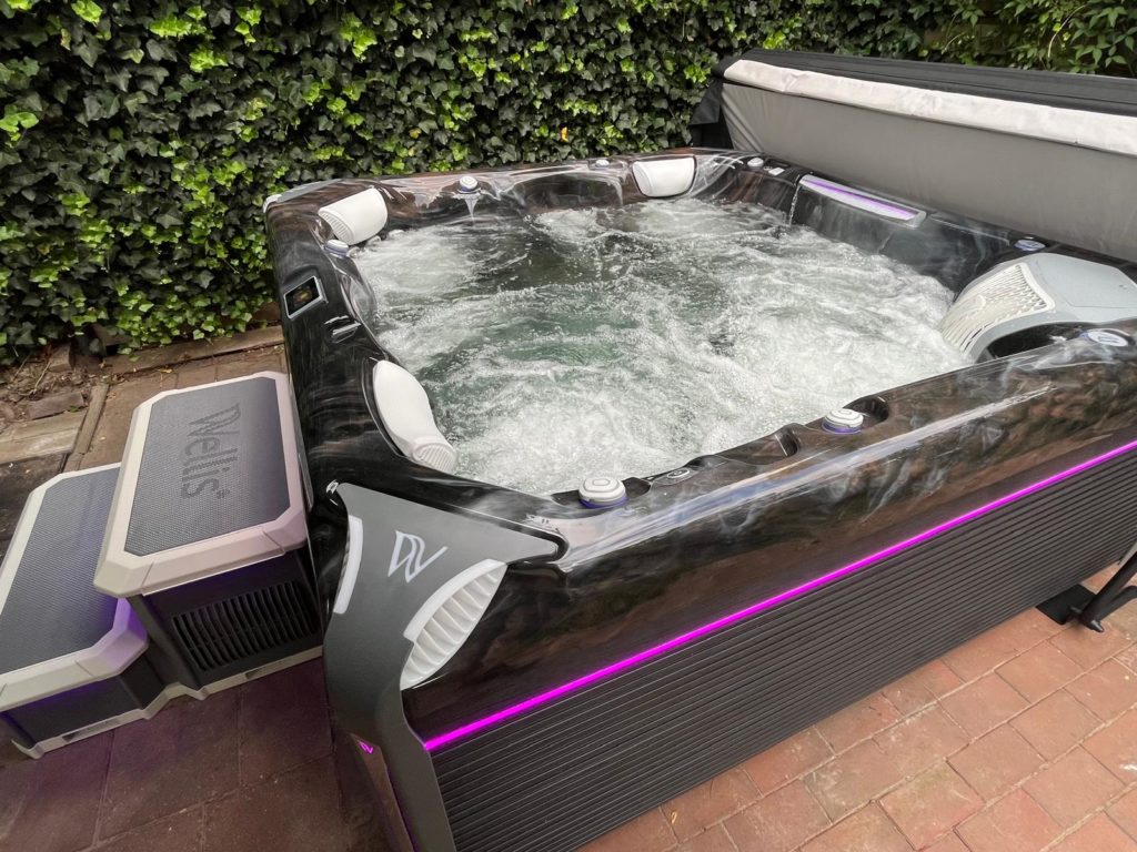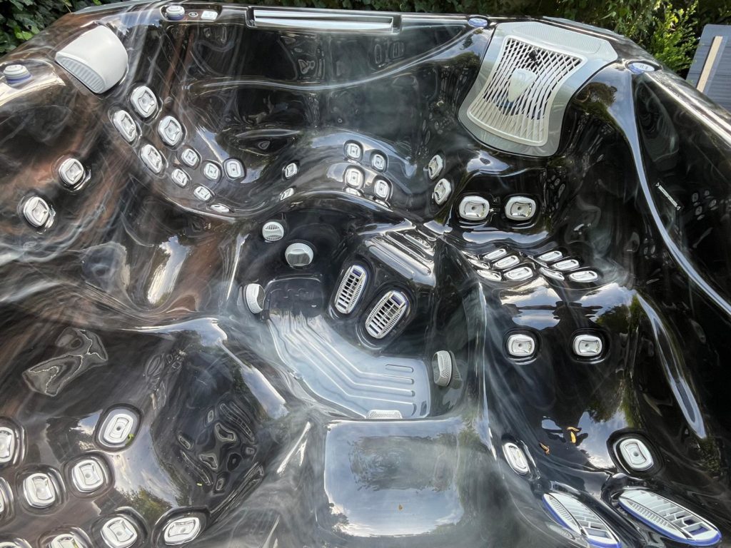 Een ruime whirlpool geplaatst met alles erop en eraan: infinity jets voor een brede massage, verlichte jets en verlichting rondom, bluetooth speakers, Wifi verbinding en een warmtepomp verwerkt in de trap. Uitgevoerd in de kleur Midnight Canyon. Geschikt voor 5 personen.